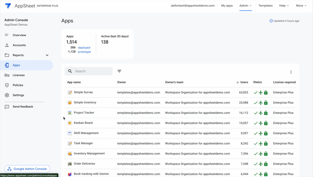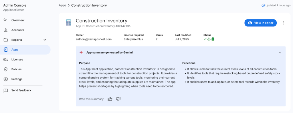 AppSheet Enterprise Plus をご利用の管理者は、組織が所有するアプリの概要をGemini に生成させることが可能になりました。これにより、管理者はあらゆるAppSheet アプリの目的と機能をより迅速に把握できるようになります。