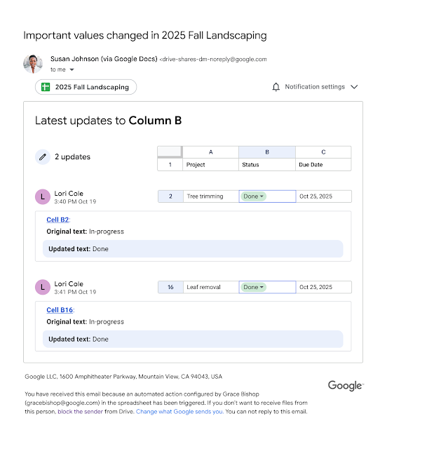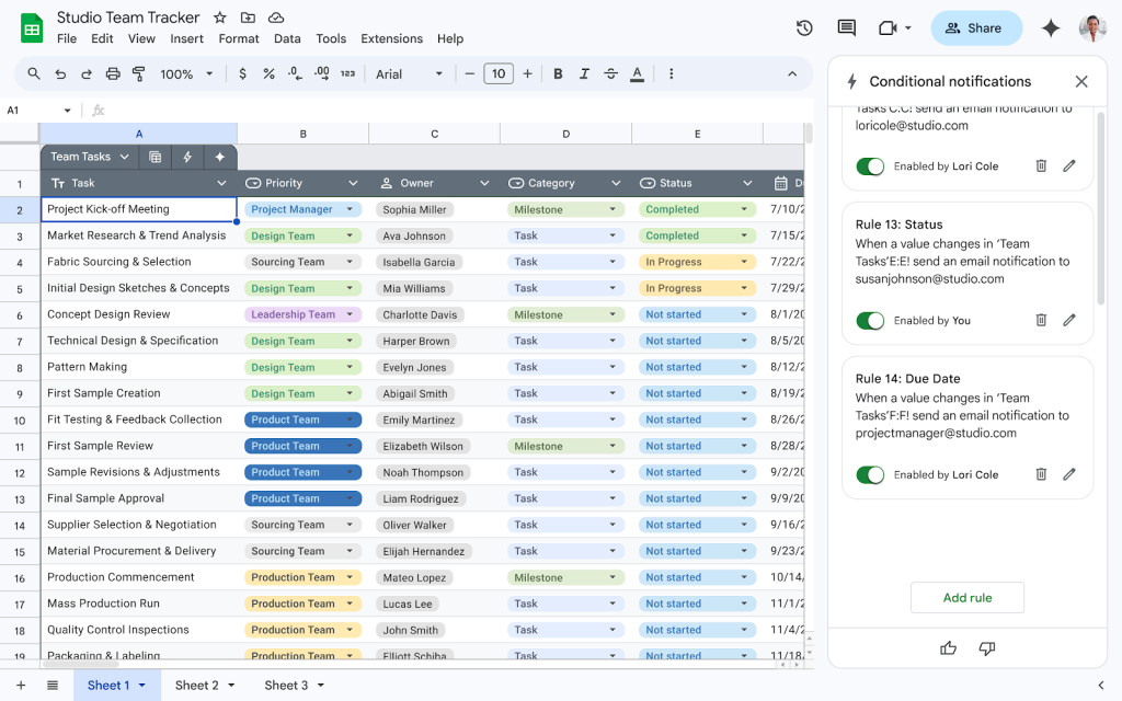 昨年、Google スプレッドシートに条件付き通知機能を導入しました。これにより、Google スプレッドシート内でルールを作成し、特定の条件が満たされた際にメール通知を送信できるようになりました。今回、条件付き通知のルール制限をスプレッドシートあたり10個から20個に拡大します。例えば、特定のタスクのステータスが変更された時や、自分が担当者として追加された時に通知を受け取るように設定できます。スプレッドシートごとのルール制限を拡大することで、この機能をより頻繁により幅広いユースケースでご活用いただけるようになります。