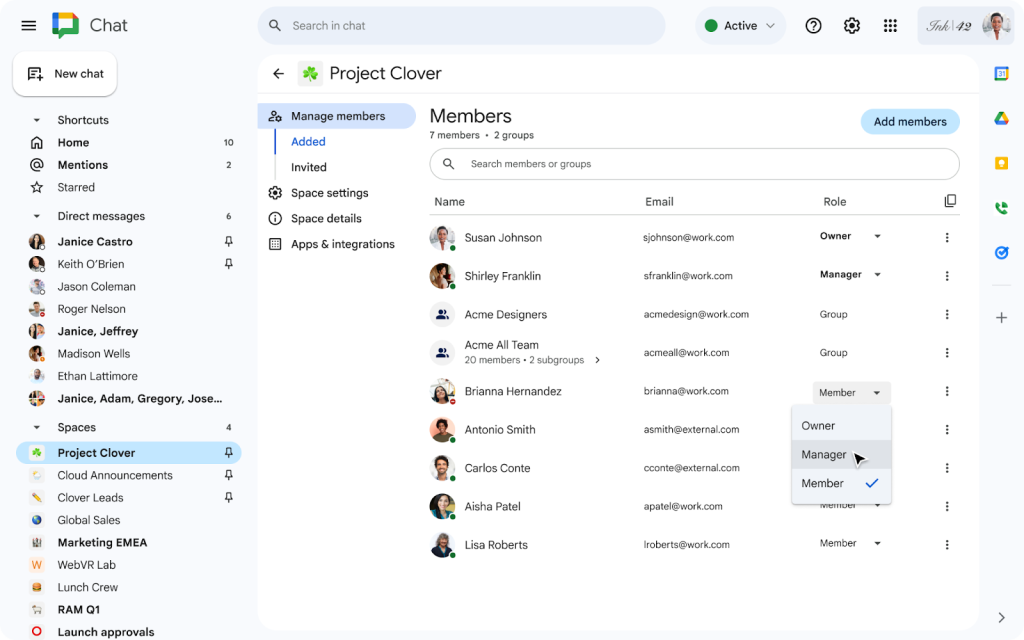 Google Chat のスペースに、マネージャーおよびメンバーに加え、オーナーの役割を導入します。役割を増やすことで、スペース管理に関連するタスクを適切な同僚と共有しやすくなります。例えば、マネージャーはオーナーのスペース管理タスクの一部を支援できるようになり、オーナーはスペースに対する完全な管理権限を維持します。