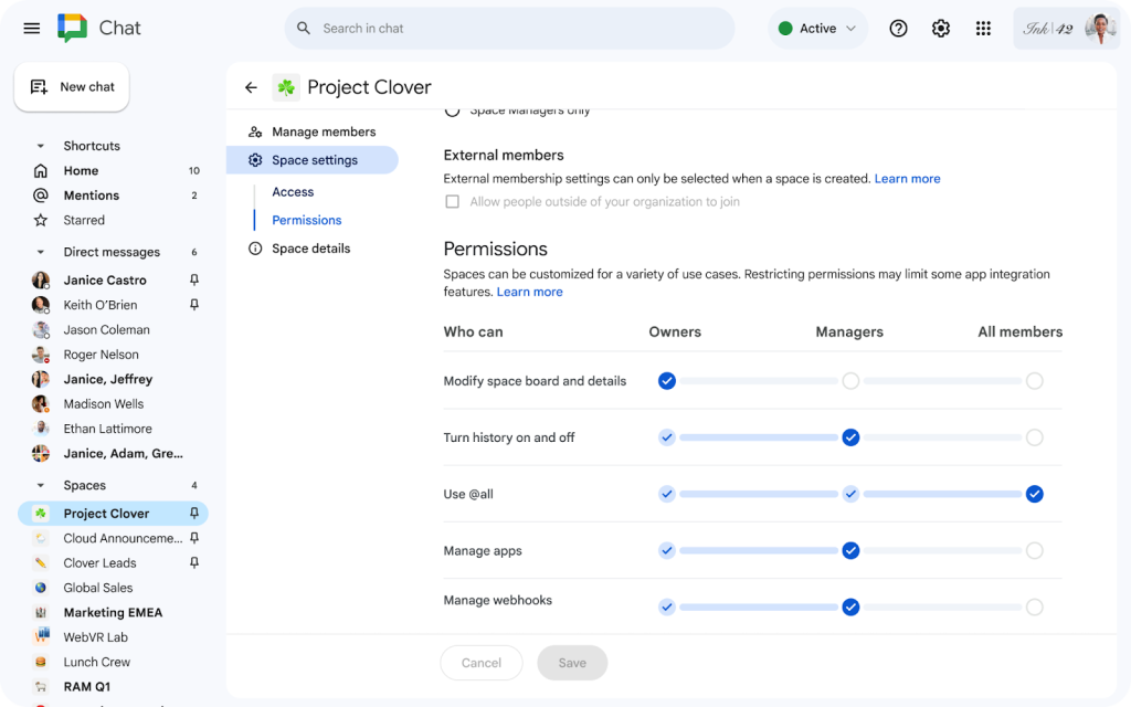 オーナーとマネージャーの両方が、スペース設定においてどの役割(メンバー、マネージャー、オーナー)にどの権限を付与するかを制御できるようになります。例えば、「@all」機能の使用、アプリの追加、履歴のオン / オフ切り替えなどが該当します。