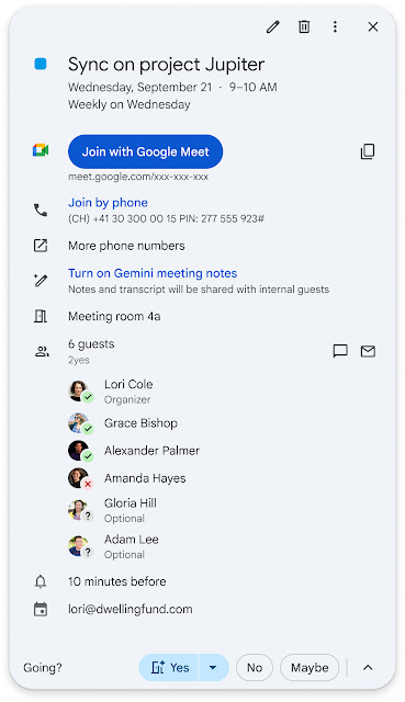 Gemini によるメモ作成がさらに簡単になりました。イベント主催者は、Google カレンダーでイベントをスケジュールする際や会議の準備中に「自動メモ生成」機能を有効にできます。
