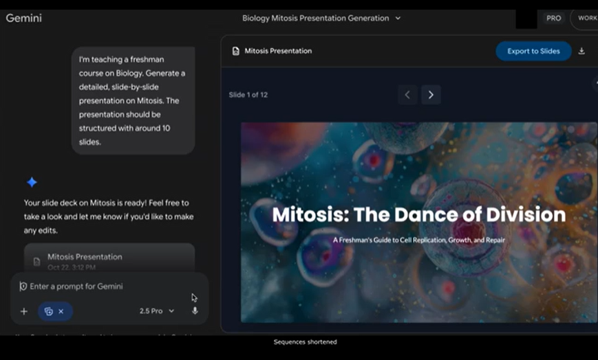 Gemini アプリでCanvas を通じてスライドプレゼンテーションを作成する機能を導入します。簡単なテキストプロンプトでアイデアを提供する、またはソースをアップロードするだけで、Gemini がテーマと関連画像を備えたスライドセットを生成します。その後、Gemini アプリから直接Google スライドにプレゼンテーションをエクスポートし、さらに磨きをかけたり他者と共同作業したりできます。