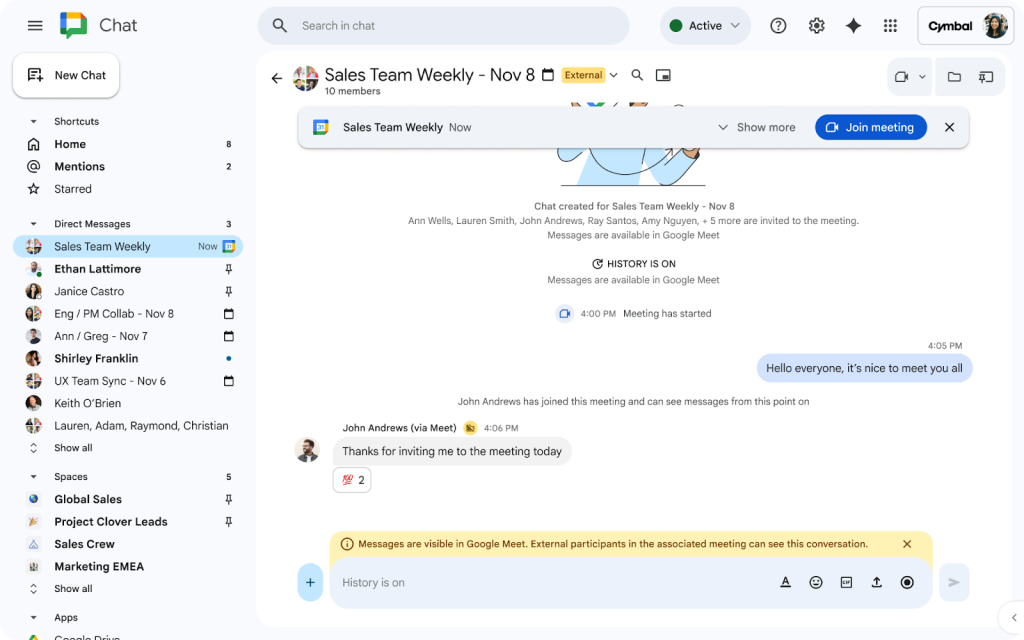 この変更により、Google Chat の機能がGoogle Meet に統合され、会議中のメッセージング体験がより豊かになります。会議参加者は、Google Meet 内で直接絵文字でメッセージに返信したり、画像やファイルを共有したりできるようになりました。参加者は会議前にGoogle Chat で事前資料やその他の会議資料をグループに送信でき、これらのリソースは通話中ずっとGoogle Meet 内で利用可能です。今回のリリースでは、すべてのメッセージと会話がGoogle Chat に統合されるため、メッセージや共有ファイルを一箇所で簡単に見つけられるようになります。