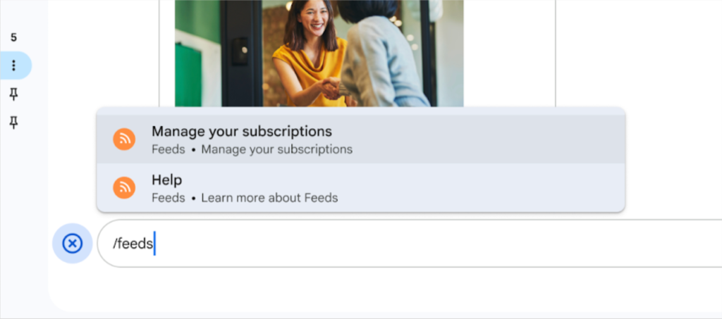 この機能の目的は、外部の情報ソースを確認するために画面を切り替える(コンテキスト スイッチング)必要をなくすことです。RSS / Atom フィードを接続することで、新しい投稿がGoogle Chat 内の指定されたスペースに自動的に送信され、進行中のプロジェクトに関する議論の流れの中で、すべてのチーム メンバーが常に最新情報を把握できるようになります。