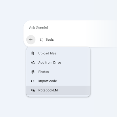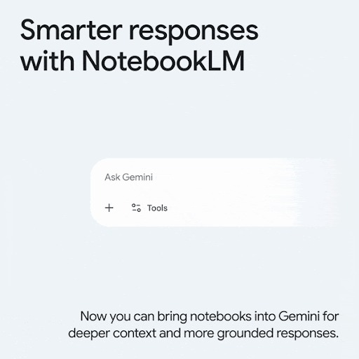 NotebookLM はPDF やGoogle ドキュメントなどを含む膨大なドキュメントのコレクションから情報を統合するための強力なツールであり、すべてに明確で引用可能なソースが付随します。ノートブックをGemini に直接追加することで、ユーザーはこの深く具体的な知識ベースをシームレスに活用し、Gemini の高度な対話機能やコンテンツ作成機能を最大限に引き出して、より関連性の高い回答を得ることができます。