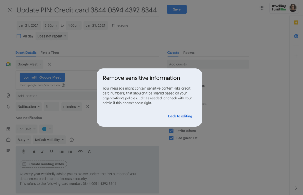• ユーザーへの通知: カレンダーの DLP ポリシーにより、機密データが検出されるとユーザーは即座にフィードバックを受け取ります。ウェブ上では、問題を説明するポップアップ通知が表示されます。管理者は、このメッセージをより具体的な詳細でカスタマイズすることも可能です。Android、iOS、または Calendar API を介した予定の更新がブロックされた場合、ユーザーにはポリシー違反と予定の招待状への変更が成功しなかった理由を説明する自動メール通知が届きます。