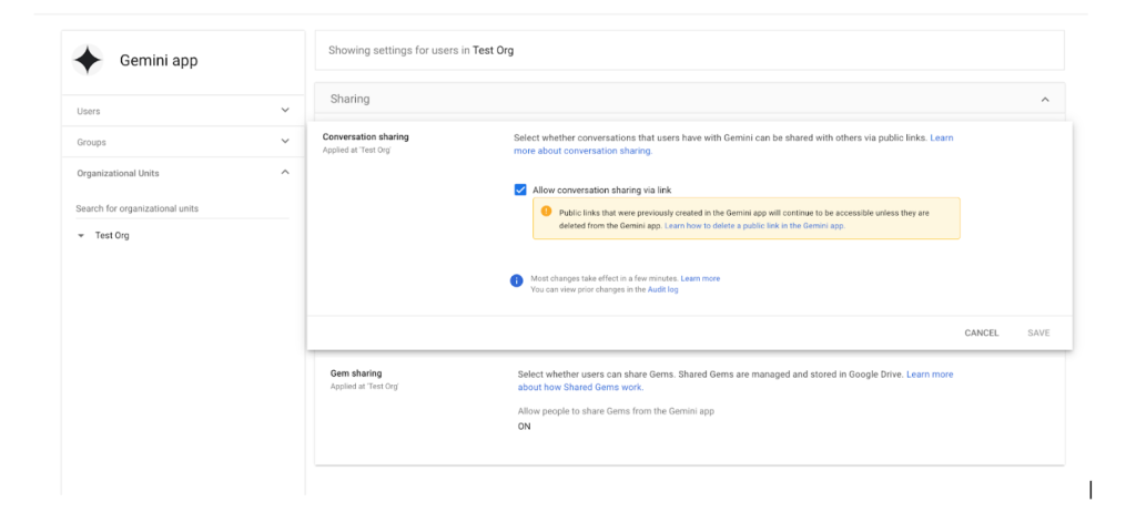 Google Workspace 管理者には、組織内のユーザーが公開リンクを使用して Gemini の会話を共有することを許可するための新しい制御機能が提供されます。